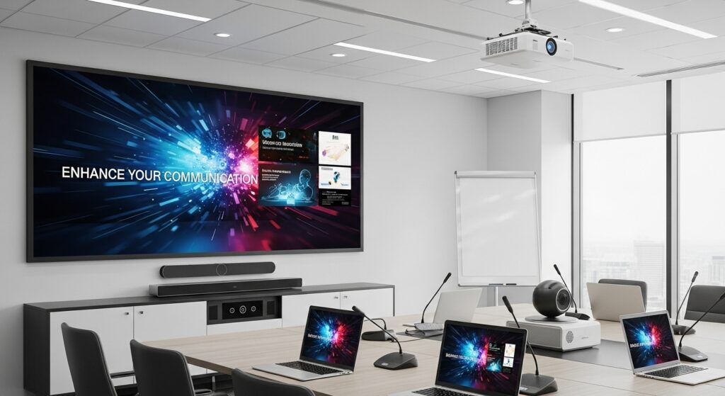 Transformez vos salles de réunion, espaces de présentation et zones d’accueil avec nos solutions audiovisuelles professionnelles. Du simple écran au système de vidéoconférence complet, nous avons la solution adaptée à vos besoins.